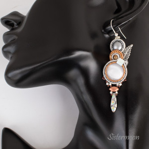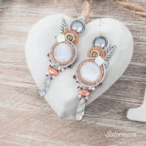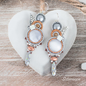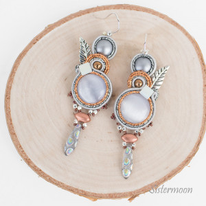 Lekkie smukłe kolczyki sutasz w pastelowych barwach z przewagą srebra i szarości. Szare kocie oko, hematyty, czeskie i japońskie, sutasz czeski i amerykański metaliczny, bigle otwarte. Wysokość 7,5 cm z biglem (bez bigla 6 cm), szerokość 2 cm. Spód wykończony szarą skórką.