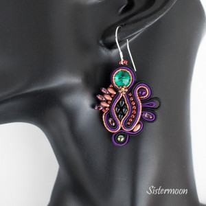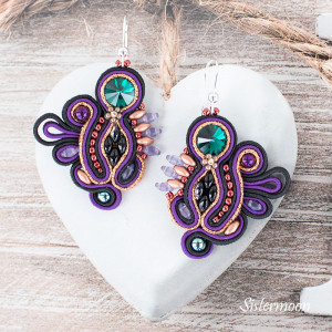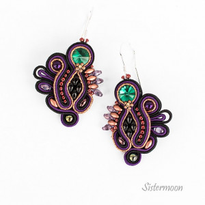 Autorskie kolczyki sutasz, nieduże, pasują na każdą okazję. Wykonane z kryształków rivoli, hematytów, Toho, sutaszu. Bigle otwarte. Tonacja: szmaragd, fiolety, brązy, purpura, stare złoto, miedź, metaliczna czerwień. Sutasz od spodu wykończony skórką. Wymiary kolczyków: 3,5 cm wysokości sam sutasz (z biglem 5 cm), 3 cm szerokość.