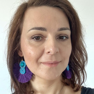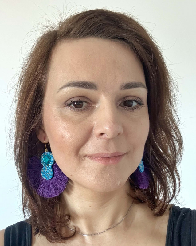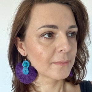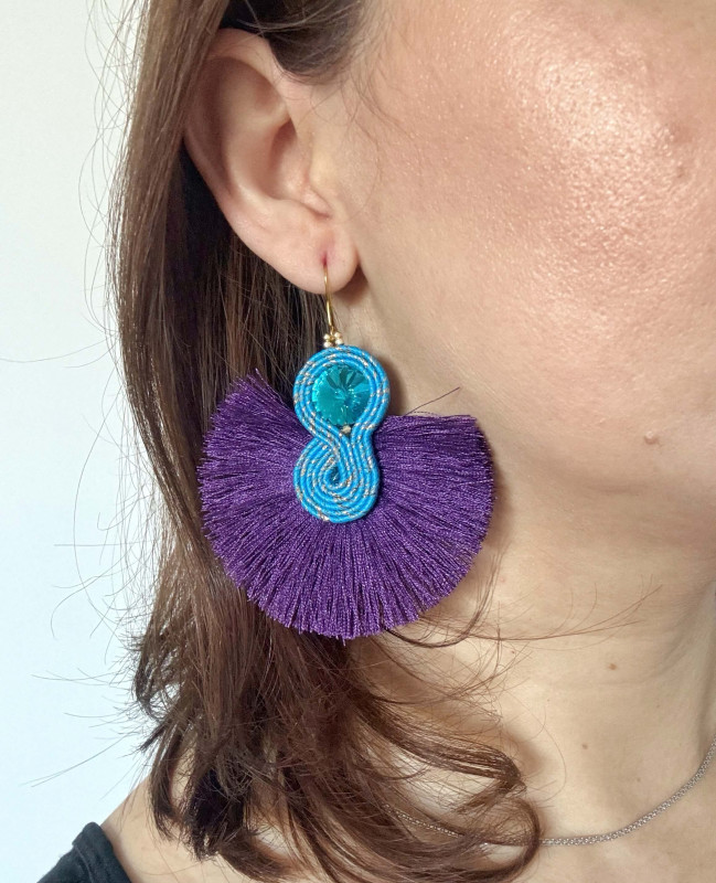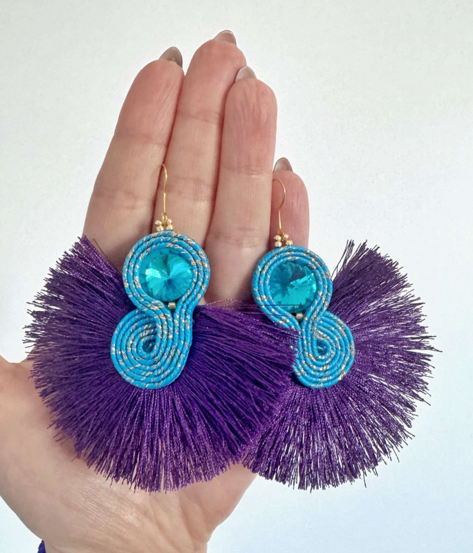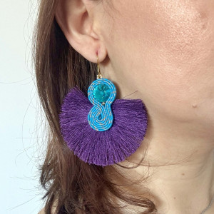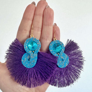Te ręcznie wykonane kolczyki sutasz to połączenie intensywnych barw i oryginalnego wzornictwa. Turkusowe kryształy otoczone misternie ułożonym sutaszem w odcieniach błękitu i złota pięknie kontrastują z fioletowymi frędzlami, tworząc efektowną całość. Kolczyki są lekkie, wygodne i dodają stylizacjom odrobiny artystycznego ducha. Doskonałe dla kobiet, które kochają oryginalną, handmade biżuterię!