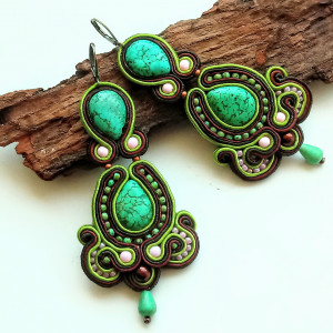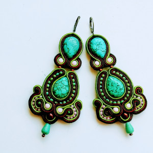 Kolczyki wykonane w technice haftu sutaszowego - szyje się kolorowe sznureczki milimetr po milimetrze, wszywając między nie kamienie i minerały, szkło itp.