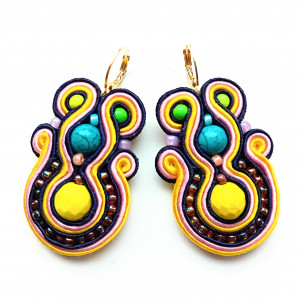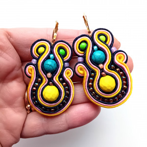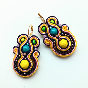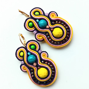 Kolczyki wykonane w technice haftu sutaszowego - szyje się kolorowe sznureczki milimetr po milimetrze, wszywając między nie kamienie i minerały, szkło itp.