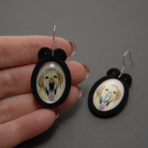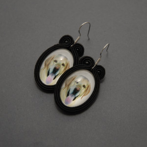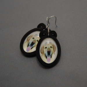 oferuję kolczyki zrobione haftem sutasz, ozdobione szklanym kaboszonem z psami (labrador)