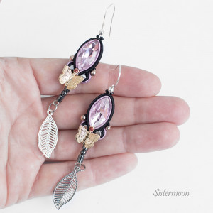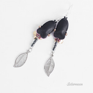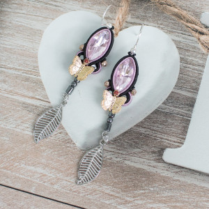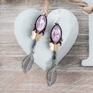 Autorskie kolczyki sutasz motylki, smukłe i lekkie. W swobodnym stylu. Fasetowane szklane kaboszony, granaty, hematyty, metalowe motylki i listki, nieścieralne koraliki Toho, bigle otwarte antyalergiczne. Sutasz od spodu wykończony czarną naturalną skórką. Wymiary kolczyków: 8 cm wysokości sam element ozdobny (plus 1,5 cm bigiel), 1,5 cm szerokość.