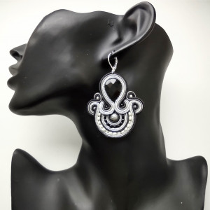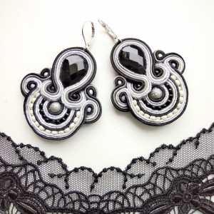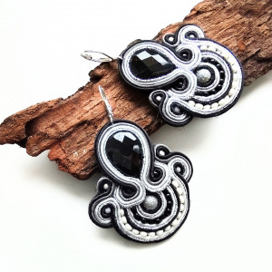 Kolczyki wykonane w technice haftu sutaszowego. Szyje się kolorowe sznureczki ze sobą, wszywając między nie - milimetr po milimetrze - minerały, szkło, koraliki ceramiczne itp.