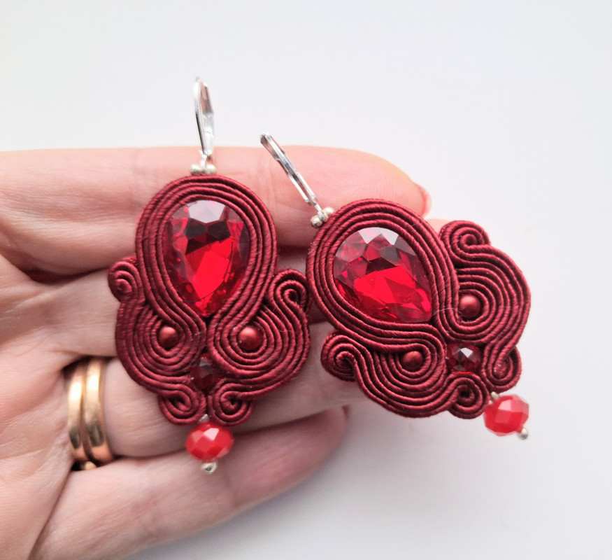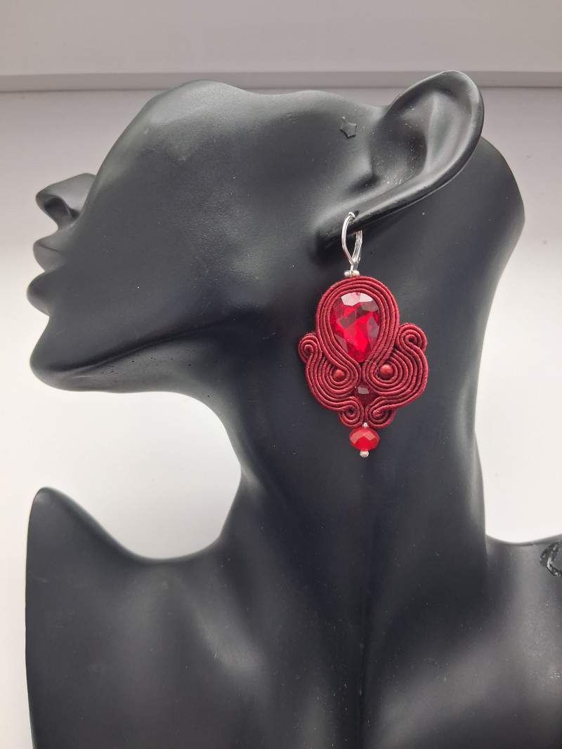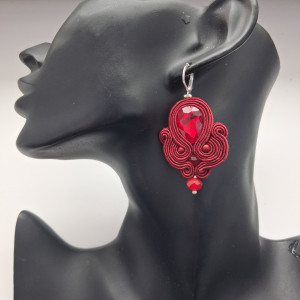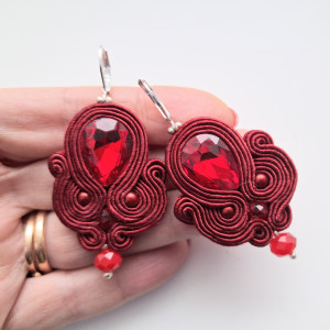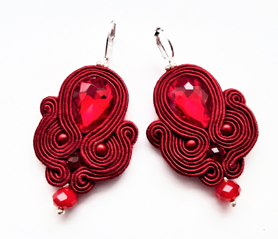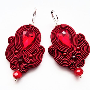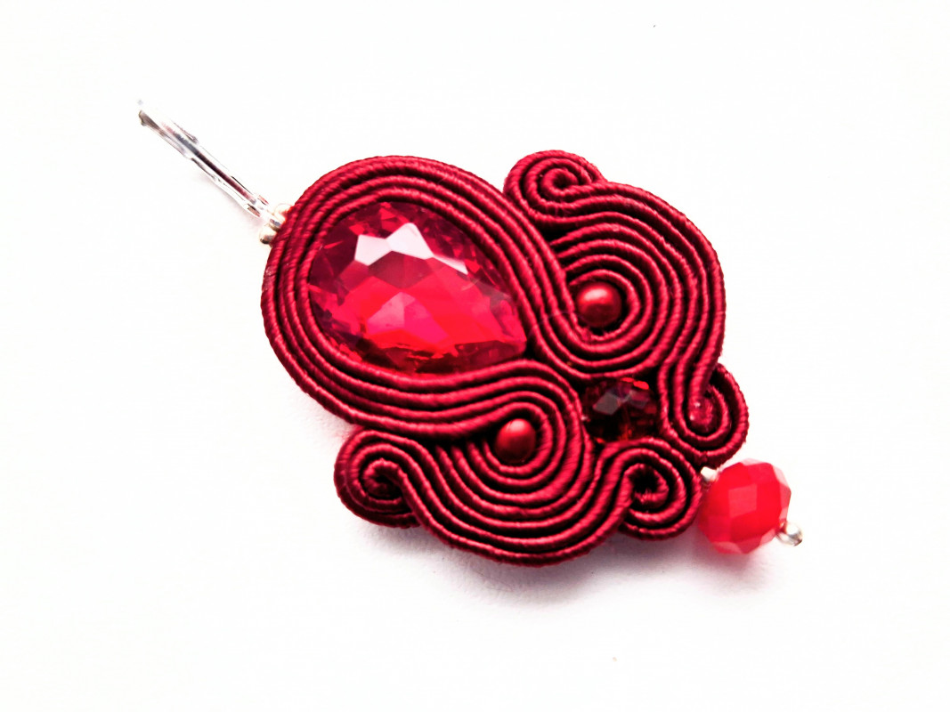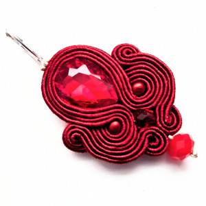 Kolczyki wykonane w technice haftu sutaszowego. Szyje się kolorowe sznureczki ze sobą, wszywając między nie - milimetr po milimetrze - minerały, szkło, koraliki ceramiczne itp.