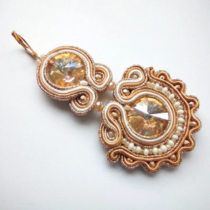 Materiał: sutasz, Swarovski rivoli w kolorze jedwabiu, japońskie koraliki Toho, koraliki Fire Polish