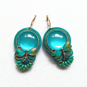 Kolczyki wykonane w technice haftu sutaszowego. Szyje się kolorowe sznureczki ze sobą, wszywając między nie - milimetr po milimetrze - minerały, szkło, koraliki ceramiczne itp.