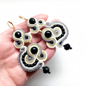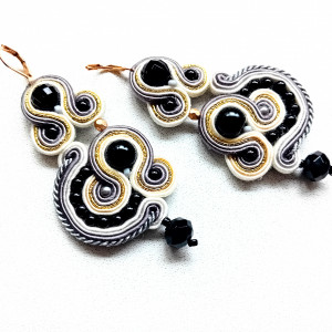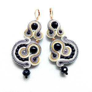 Kolczyki wykonane w technice haftu sutaszowego. Szyje się kolorowe sznureczki ze sobą, wszywając między nie - milimetr po milimetrze - minerały, szkło, koraliki ceramiczne itp.