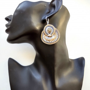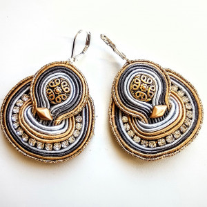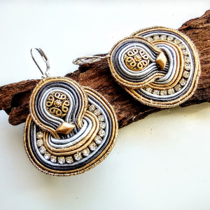 Kolczyki wykonane w technice haftu sutaszowego. Szyje się kolorowe sznureczki ze sobą, wszywając między nie - milimetr po milimetrze - minerały, szkło, koraliki ceramiczne itp.