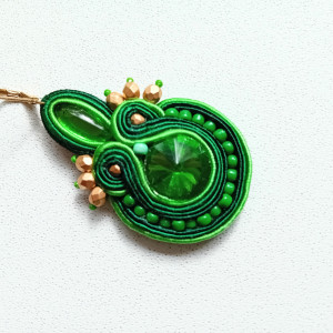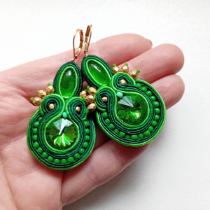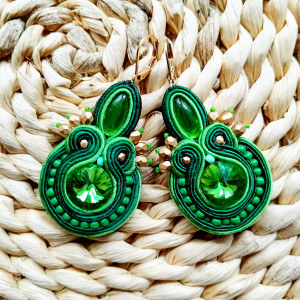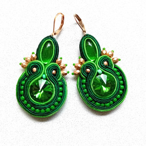 Kolczyki wykonane w technice haftu sutaszowego - szyje się kolorowe sznureczki milimetr po milimetrze, wszywając między nie kamienie i minerały, szkło itp.
