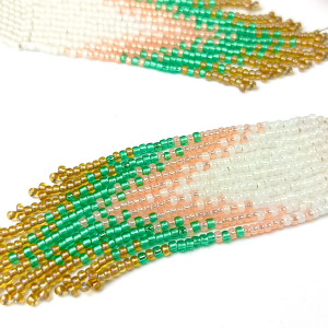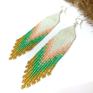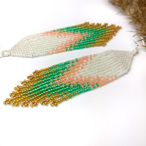 Oryginalne, długie kolczyki, tzw. „japońce” wykonane w całości ręcznie z drobnych koralików TOHO. Zawieszone są na biglach ze stali szlachetnej (na życzenie mogę wymienić na srebrne), bardzo lekkie. Wymiary: długość kolczyka z biglem 12 cm; szerokość kolczyka ok 2,5 cm. Pasują do każdej stylizacji. Zapakowane w ozdobne pudełko więc nadają się również na prezent.