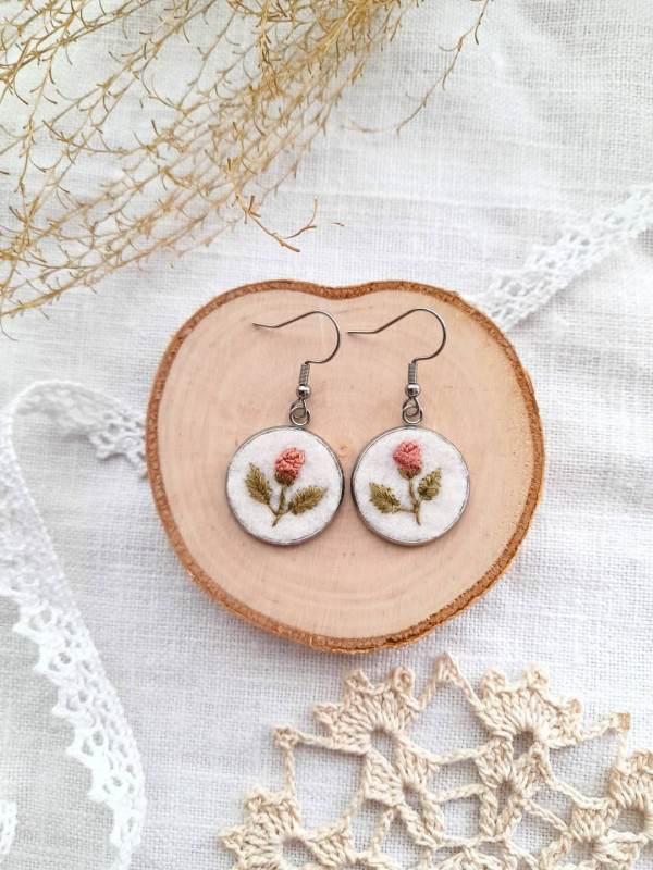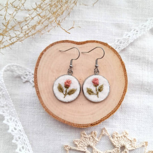Delikatne, lekkie, haftowane ręcznie kolczyki z różami w kolorze brzoskwiniowym dla wielbicielek niepowtarzalnej kwiatowej biżuterii.