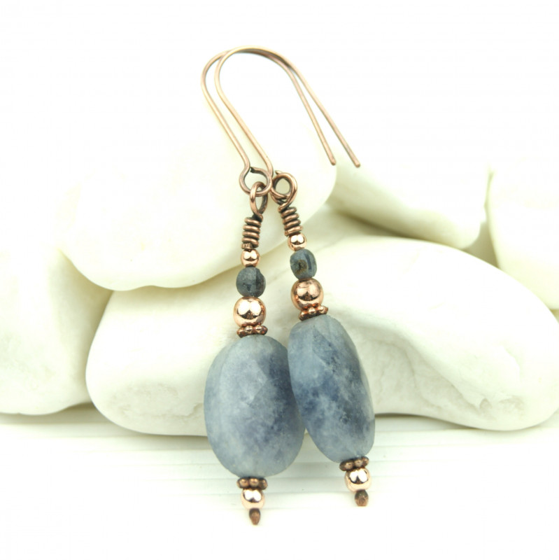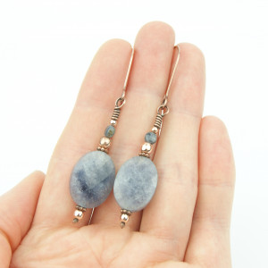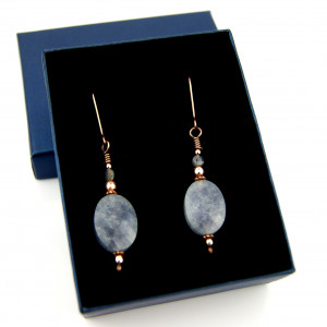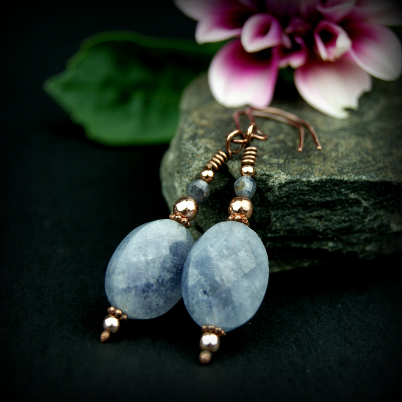 Wiszące kolczyki wykonane z miedzi i minerałów. Do stworzenia kolczyków użyto fasetowanych kamieni akwamarynu i szafirów oraz drutu miedzianego, całość oksydowano. Kolczyki są lekkie i delikatne.