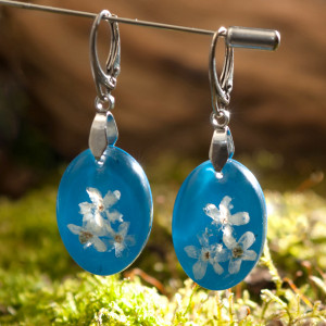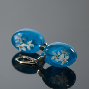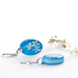 Kolczyki wykonałam z transparentnej żywicy, w której zatopiłam białe niezapominajki, dla podniesienia kontrastu dodałam niebieskie tło. Całość wykonałam ręcznie, wypolerowałam na wysoki połysk. Kolczyki są w kształcie owalu. Rozmiar 24 mm, szerokość 17 mm, grubość 6,5 mm. Bigle angielskie ze srebra 925. Kolczyki są jedyne i niepowtarzalne, mogą stać się świetnym prezentem dla ukochanej osoby.