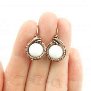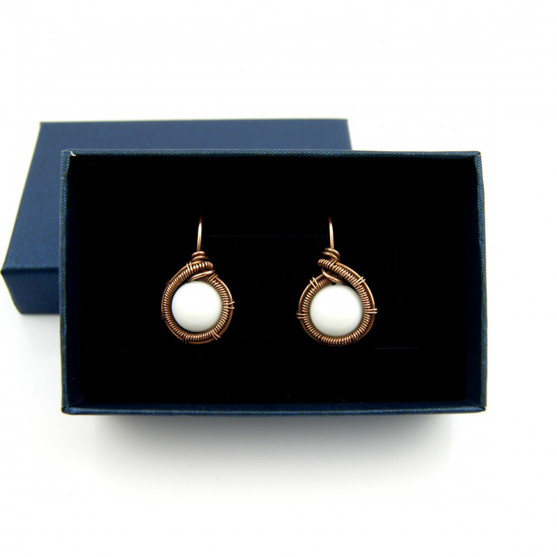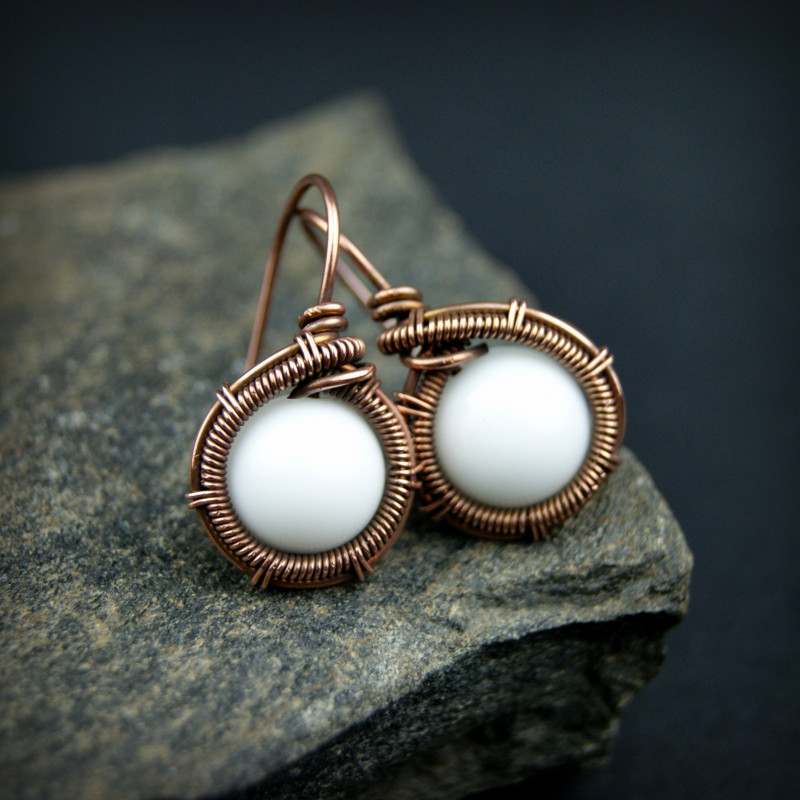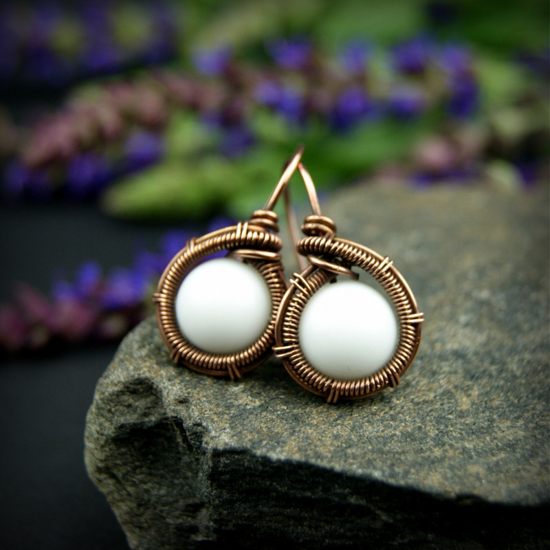 Kolczyki w całości wykonane w pracochłonnej technice wire wrapping. Do stworzenia kolczyków użyto białych kamieni jadeitu oraz drutu miedzianego, całość oksydowano. Kolczyki są lekkie i delikatne.