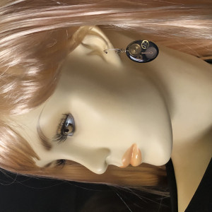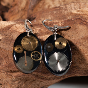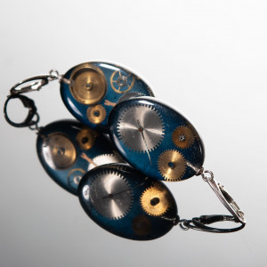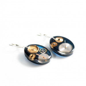 Kolczyki wykonałam z żywicy, w której zamieściłam części z rozebranych zegarków mechanicznych. Dla podniesienia kontrastu dodałam żywiczne niebieskie, dymne tło. Całość wykonałam ręcznie, wypolerowałam na wysoki połysk. Kolczyki są owalne, rozmiar 20x29 mm, głębokość 8 mm. Bigle w stylu angielskim, wykonane ze srebra próby 925.