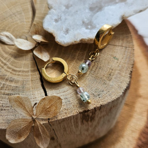 Kolczyki, które łączą w sobie zarówno baśniowy klimat, jak i nowoczesną formę. Fluoryt i frenit w delikatnych, romantycznych odcieniach liliowego i zieleni, zawieszone zostały na biglach - kajdankach ze stali szlachetnej, które nadają całości nowoczesny styl. Całość uzupełniona została delikatnymi dodatkami ze stali szlachetnej w kolorze złotym.