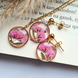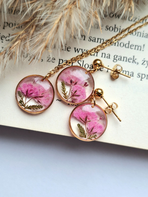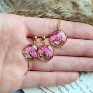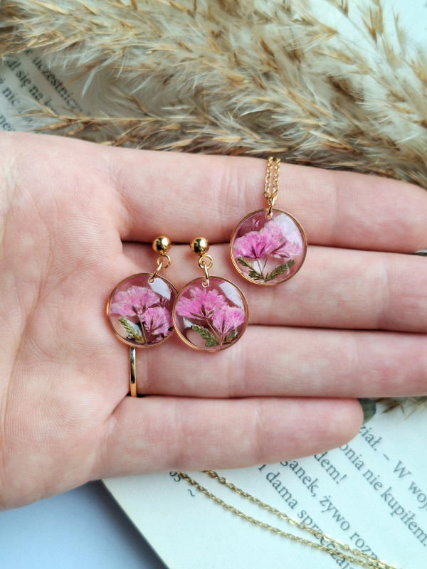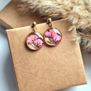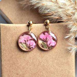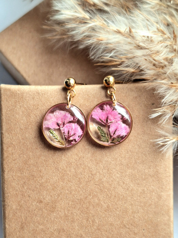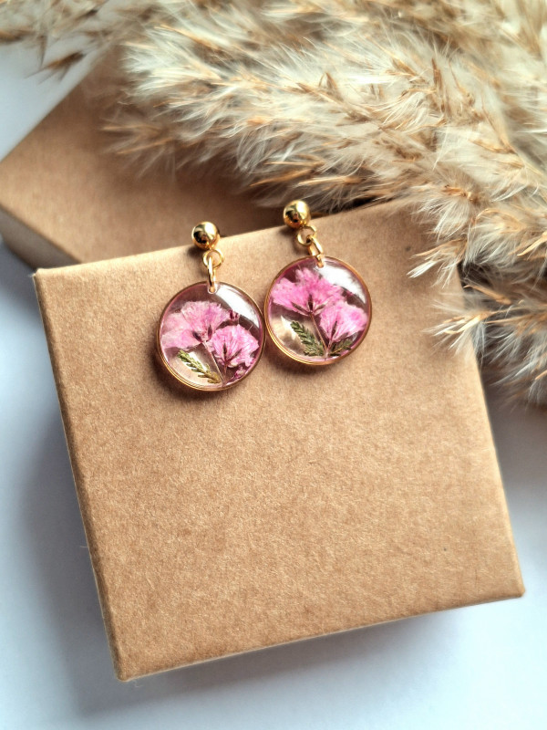 Urocze kolczyki z zatopionymi kwiatami rożowej gipsówki. Wykonane z wysokiej klasy żywicy, która nie zmienia koloru pod wpływem promieniowania UV oraz wysokiej jakości stali chirurgicznej.