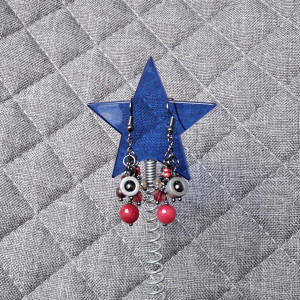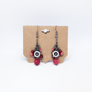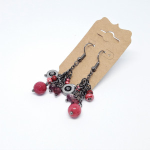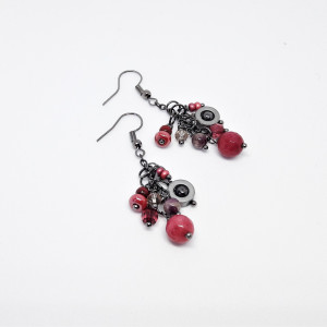 Kule z soczyście malinowego, fasetowanego jadeitu, nieco mniejsze kuleczki z granatu, kryształki szklane, koraliki drewniane i wreszcie hipnotyzująca, metalowa zawieszka - oto przepis na piękne, wyraziste kolczyki-grona.