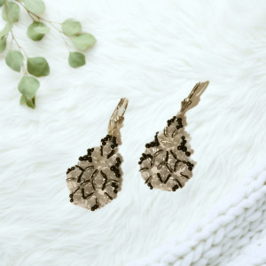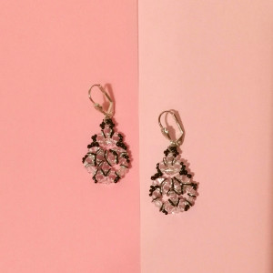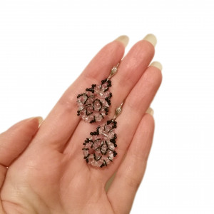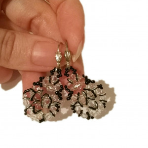 Delikatne kolczyki wykonane techniką beadingu ze szklanych przezroczystych, srebrnych oraz czarnych koralików. Bigle metalowe w kolorze srebra.