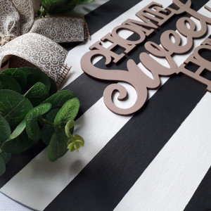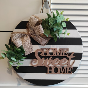 Dekoracja na drzwi lub ścianę. Wykonana z wysokiej jakości sklejki o średnicy 40 cm i grubości 1 cm. Literki również wykonane ze sklejki w celu stworzenia efektu 3D. Każdy egzemplarz jest ręcznie robiony i malowany farbami odpornymi na czynniki zewnętrzne. Dopełnieniem całości jest wstążka i sztuczne rośliny. Pięknie prezentuje się nie tylko na drzwiach, ale także może być elementem wystroju wnętrza.