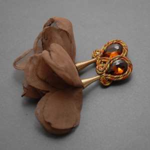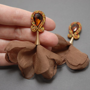 oferuję kolczyki lub klipsy zrobione techniką sutasz, ozdobione fasetowanymi kaboszonami i kwiatkami z materiały