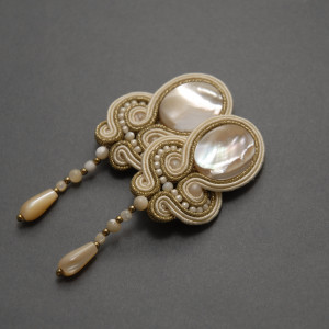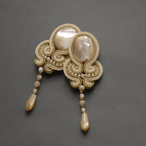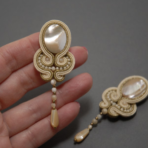 oferuję kolczyki lub klipsy zrobione haftem sutasz, ozdobione masą perłową, hematytami i drobnymi koralikami