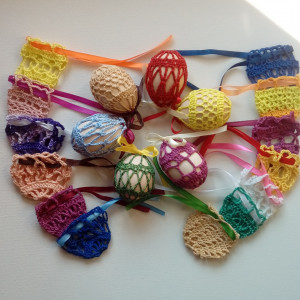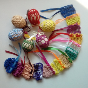 Komplet 18 szt kolorowych koronkowych koszulek na jajka wykonanych ręcznie z bawełnianego kordonka. Zawiązywane wstążeczką na kokardkę, dzięki czemu koszulki można bardzo łatwo zakładać i zdejmować. Koszulki są wielokrotnego użytku, nie gniotą się, można ubierać je na jajka, wydmuszki, lub na jajka plastikowe (wielkości jaj kurzych). Łatwe do przechowywania na przyszłość, ponieważ nie zajmują dużo miejsca. Przedmiotem sprzedaży jest komplet 18 szt. Gotowe do wysyłki. Możliwość zamówienia w innym kolorze lub ilości - do uzgodnienia.