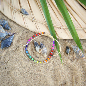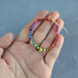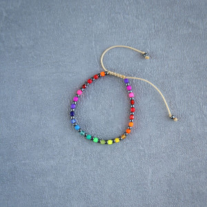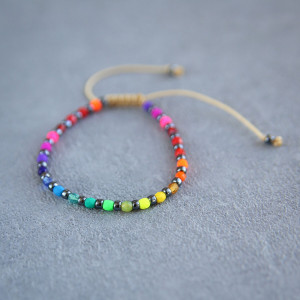 Bransoletka ze szklanych koralików w kolorach tęczy.