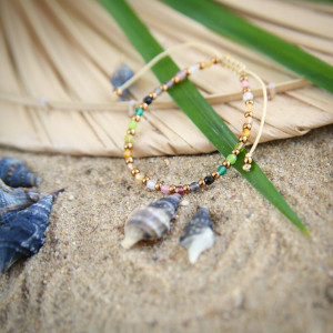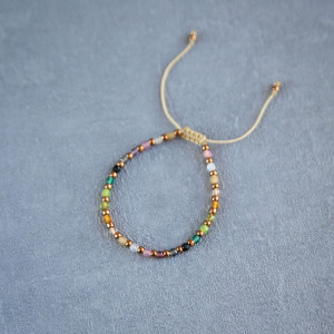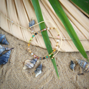 Bransoletka ze szklanych koralików w naturalnych, subtelnych kolorach połączonych z ciemnym złotym.