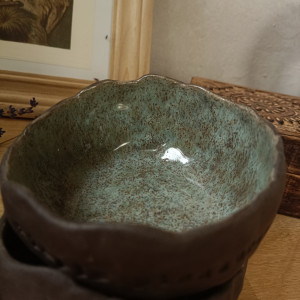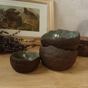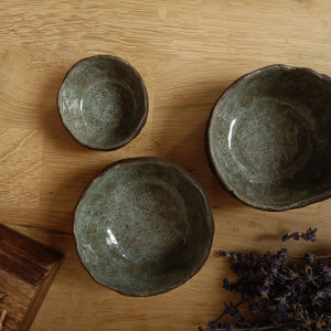 Komplet 3miseczek w nieregularnym kształcie, ulepiony z ciemno-brązowej gliny. Od środka miseczki pokryte niebieskim szkliwem w brązowe kropeczki.