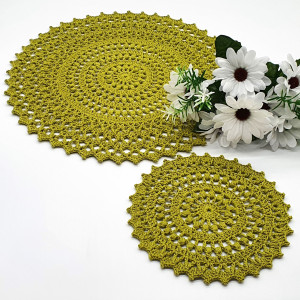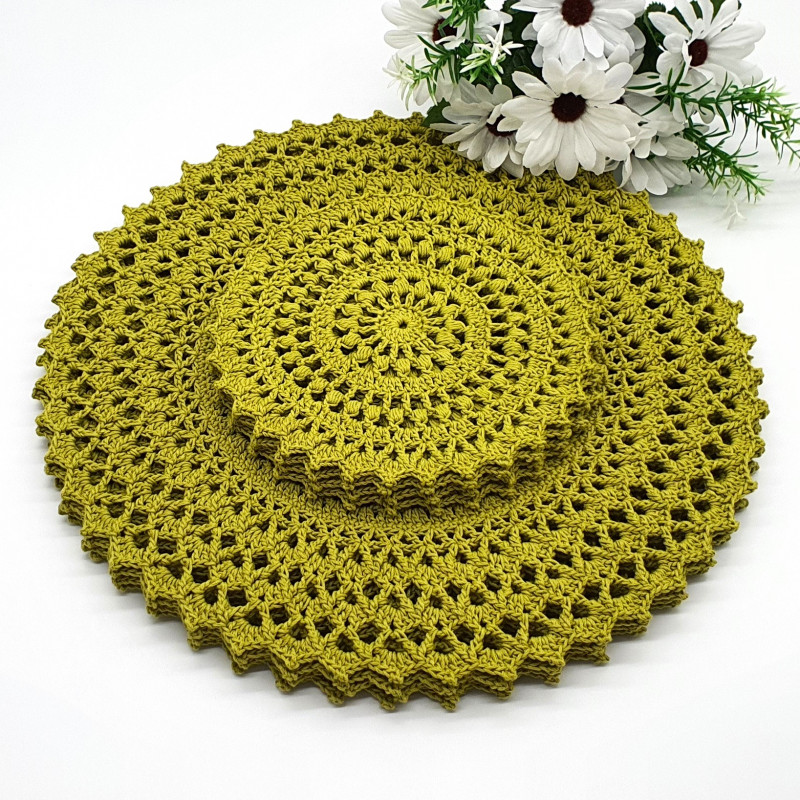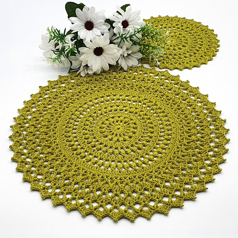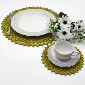 Komplet podkładek w kolorze oliwkowym, wykonany został na szydełku, z kordonka wyprodukowanego w Polsce. 4 podkładki pod talerz 39 cm i 4 podkładki pod filiżankę 21 cm.