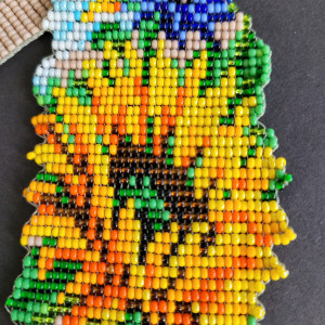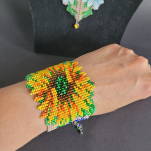 Unikatowy komplet biżuterii wykonany ręcznie metodą tkania koralikami. Wzór inspirowany naturą – piękne kwiaty w intensywnych barwach (niebieskie, żółte, białe i zielone) tworzą niezwykle efektowną i elegancką kompozycję.