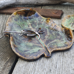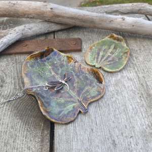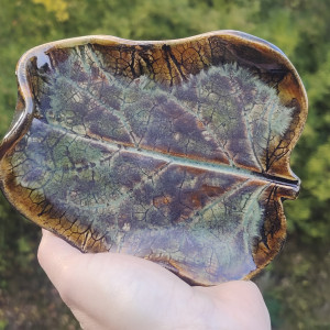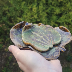 Komplet dwóch podstawek wykonanych z jasnej gliny w której odbite zostały prawdziwe liście. Pokryte szkliwami spożywczymi w kolorze matowej zieleni oraz brązu. Urocza gra kolorów. Idealnie sprawdzą się jako podstawka na biżuterię. Formowane ręcznie, dwukrotnie wypalane w piecu do ceramiki. Zostanie zapakowany dekoracyjnie i dobrze zabezpieczony na czas transportu. Idealny na prezent. Wymiary ok 14,5x11,5cm oraz 9,5cmx8cm Kolorystyka może nieznacznie się różnić w zależności od ustawień monitora. Ta ceramika lubi mycie ręczne. Biżuteria nie jest elementem sprzedaży.
