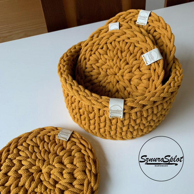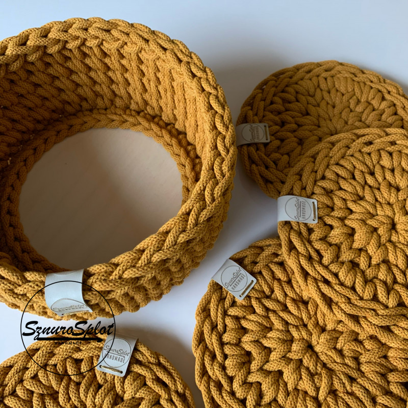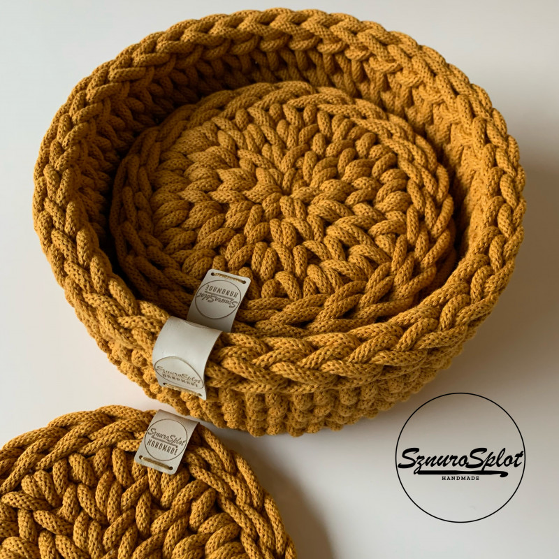 Wykonane techniką szydełkowania z bawełnianego sznurka o gr. 5 mm. w kolorze nr 18 (ze wzornika) na indywidualne zlecenie.