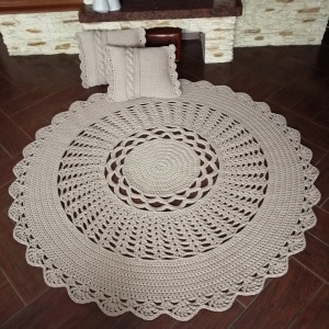 Komplet - dywan o średnicy 160cm + 2 poduszki z wkładem 40cmx40cm. Dywan wykonany jest metodą szydełkowania, poszewki na drutach, z polskiego sznurka bawełnianego 5mm. Poszewki są zdejmowane, zapinane na guziki kołki. Wkład z kulki silikonowej.