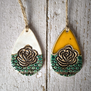 Wykonane ręcznie z jasnej gliny, na której zostały odbite motywy koronek.
