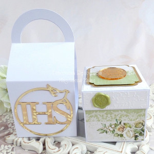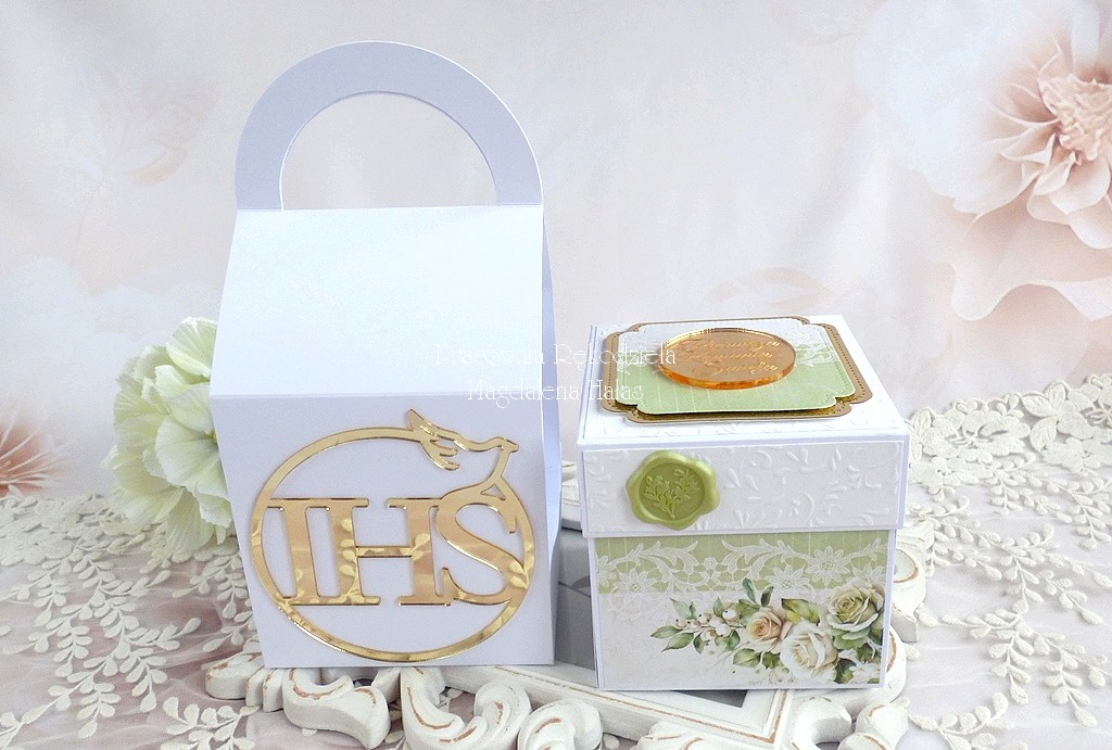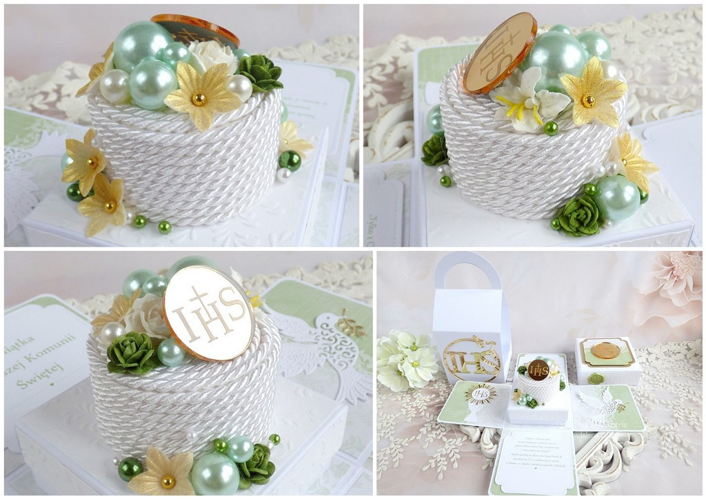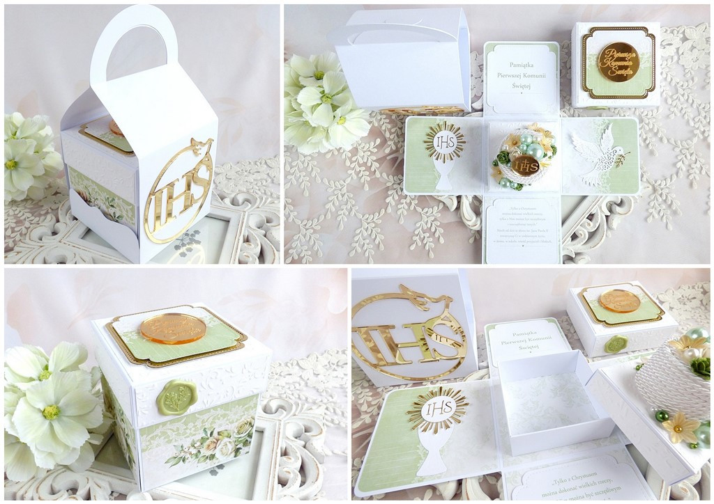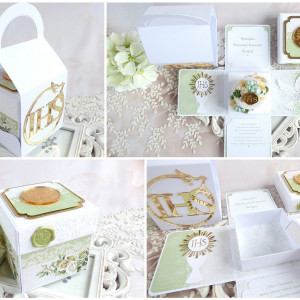 Pamiątka komunijna w formie rozkładanego pudełka - exploding box w torebce