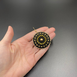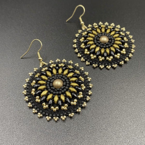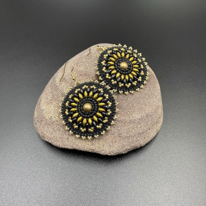 Okrągłe kolczyki wykonane zostały techniką haftu koralikowego z drobnych koralików Toho i SuperDuo, w kolorze czerni i odcieniach złota. W 100% wyszyte ręcznie. Spód kolczyków podszyty jest czarną eko skórką. Bigle otwarte ze stali chirurgicznej w kolorze złotym.