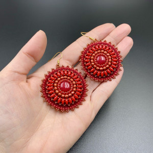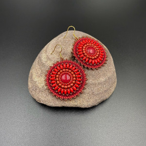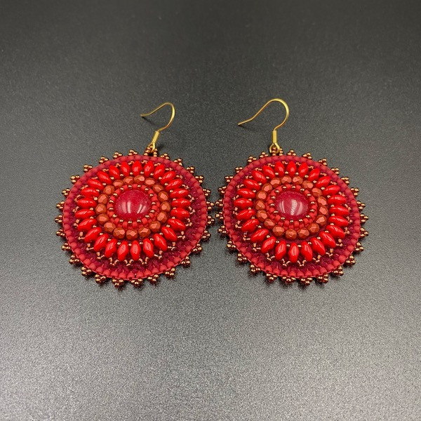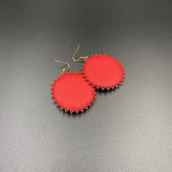 Okrągłe kolczyki wykonane zostały techniką haftu koralikowego z drobnych koralików Fire Polish, Toho i SuperDuo w 100% wyszyte ręcznie. Spód kolczyków podszyty jest czerwoną eko skórką. Bigle otwarte ze stali chirurgicznej w kolorze złotym. Środek kolczyka to czerwony jadeit 12 mm.