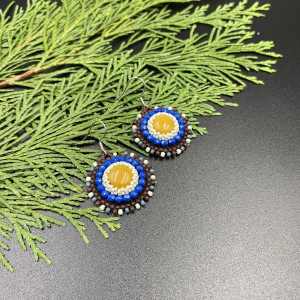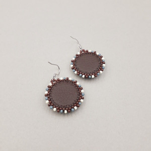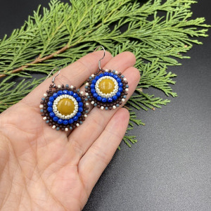 Okrągłe kolczyki wykonane zostały techniką haftu koralikowego w kolorach : brązowym, kremowym, ciemno niebieskim. Środek kolczyka to mokait 12 mm w kolorze musztardowym, otoczony koralikami Fire Polish i Toho. Spód kolczyków podszyty jest brązową eko skórką. Bigle otwarte ze stali chirurgicznej.