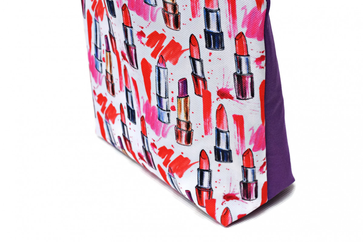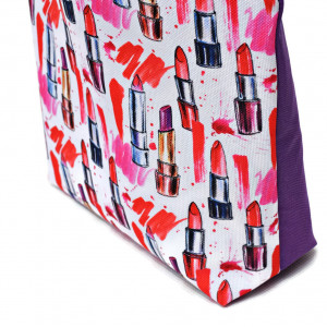 Kolorowa kosmetyczka. Uszyta z wodoodpornego materiału z wzorem, tył kosmetyczki fioletowy.