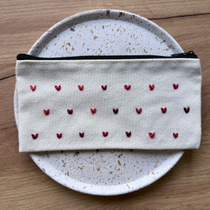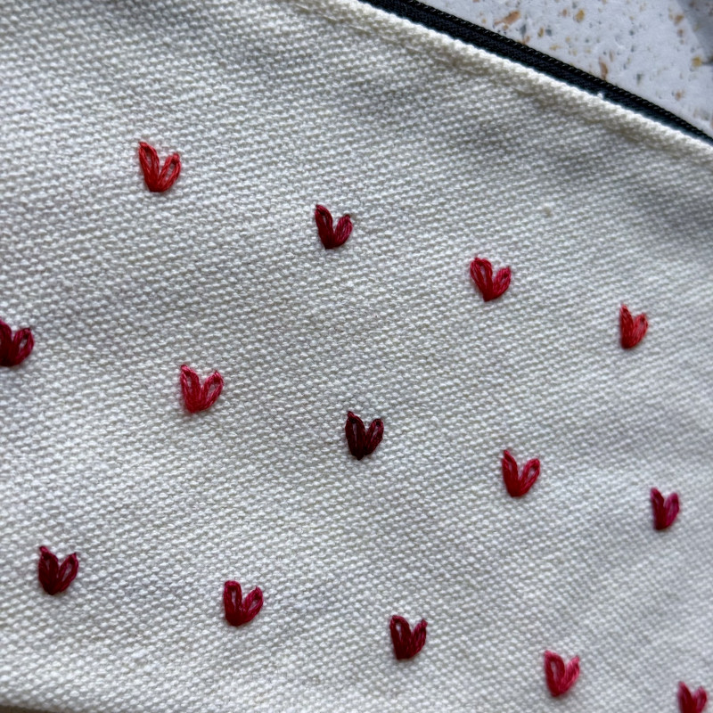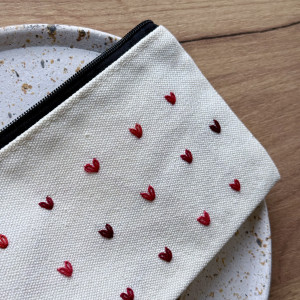 Ta kosmetyczka z ręcznie haftowanymi minimalistycznymi serduszkami w różnych odcieniach czerwieni to mały dodatek, który wywołuje uśmiech za każdym razem, gdy po nią sięgasz.