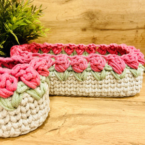 Koszyczki wykończone „kwiatuszkami” Kolor beżowy, szałwia i róż