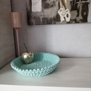 Koszyk o wymiarach 20cm i wysokość 7cm, wykonany metodą szydełkowania z polskiego sznurka bawełnianego 5mm.