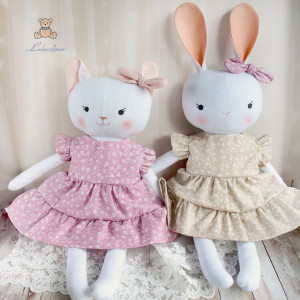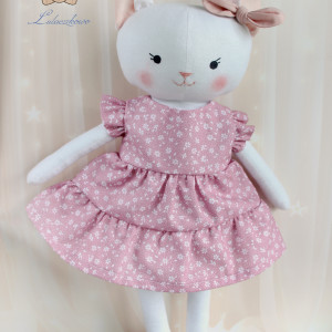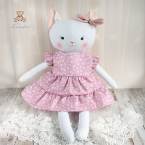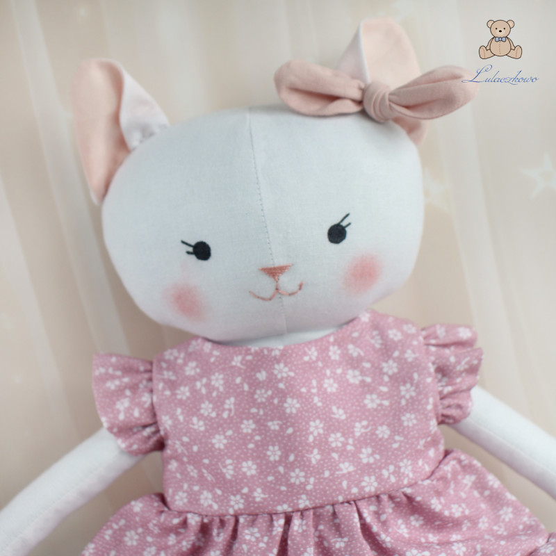 Przeurocza przytulanka, Kicia, uszyta ręcznie z najwyższą starannością, ubrana w sukieneczkę w kolorze róż retro, w drobne kwiatuszki. Wykonana ze 100% bawełny, wypełniona antyalergiczną kulką silikonową. Oczka malowane wodoodpornym markerem, nosek i uśmiech wyszyty muliną, uszko ozdobione kokardką. Górne i dolne łapki układają się luźno, kicia siedzi z podparciem. Sukieneczkę można swobodnie zdejmować, jest zapinana na rzep.