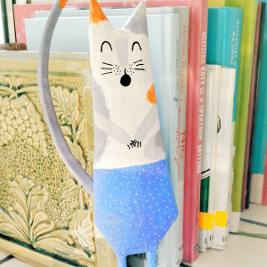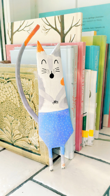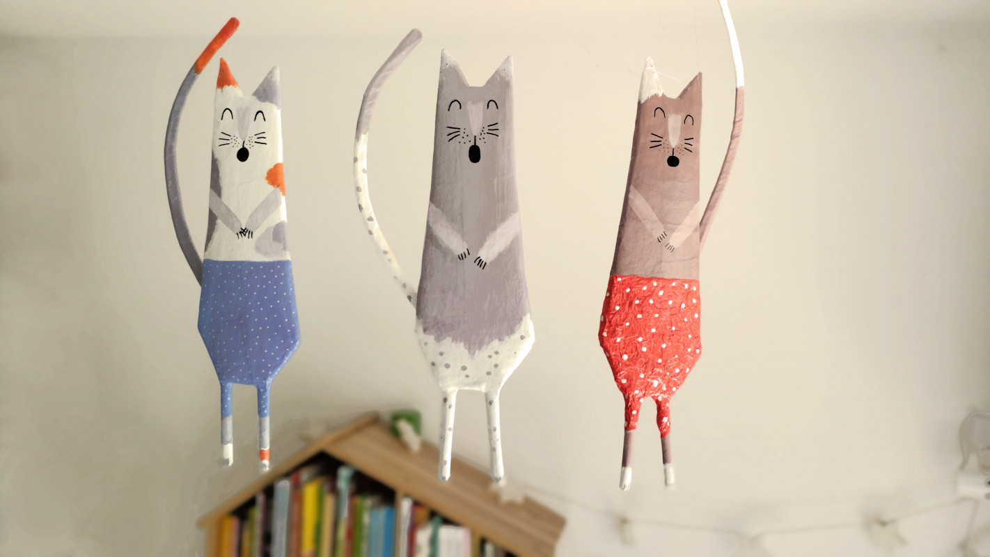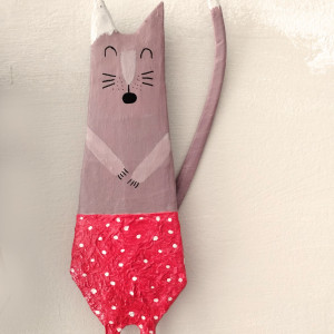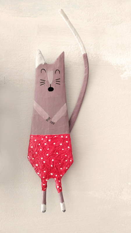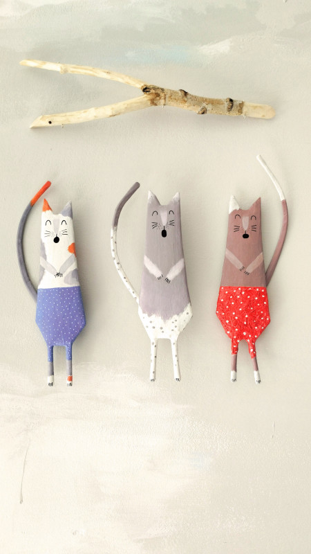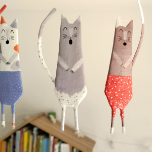 Figurki kotów wykonane są z papermache, ręcznie malowane, zawieszone na polerowanej gałązce brzozy. Malowane ręcznie farbą akrylową, zabezpieczone lakierem o delikatnym, satynowym połysku.