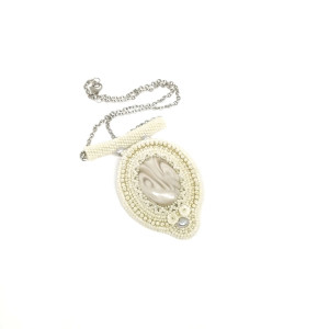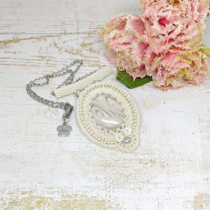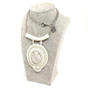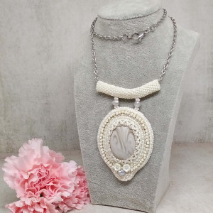I tak jest też w przypadku tego mega kobiecego i delikatnego wisiorka. Cudowny krzemień opleciony koralikami w kolorze złamanej bieli i srebra (aluminium) z dodatkiem pereł słodkowodnych. Wisiorek wykończony supersuede w kolorze kremowym i zawieszony na łańcuszku ze stali chirurgicznej.