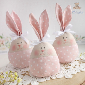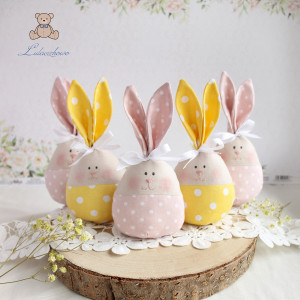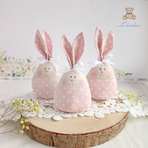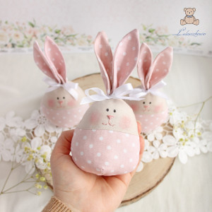 Uroczy króliczek - jajo wielkanocne, uszyty ręcznie z najwyższą starannością, z tkaniny bawełnianej w odcieniach beżu oraz pudrowego różu w groszki. Wypełniony antyalergiczną kulką silikonową, nosek i buźka wyszyte muliną, oczka malowane wodoodpornym markerem.