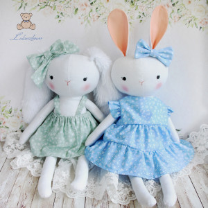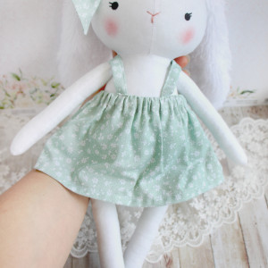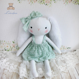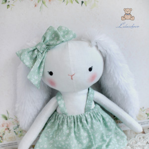 Przeurocza przytulanka, króliczek a właściwie królisia cała w bieli, uszyta ręcznie z najwyższą starannością, ubrana w miętową sukieneczkę na ramiączkach, w drobne kwiatuszki. Wykonana ze 100% bawełny, wypełniona antyalergiczną kulką silikonową, uszka uszyte z mięciutkiego futerka, opadające swobodnie. Oczka malowane wodoodpornym markerem, nosek wyszyty muliną, uszko ozdobione kokardką. Sukieneczkę można swobodnie zdejmować, zapinana jest na rzep. Górne i dolne łapki układają się luźno, królisia siedzi z podparciem.